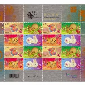 以“?;⑷鹜谩睘轭}的十二生肖金銀郵票小型張,以橙紅色作為主色,襯以牡丹花浮雕背景,予人喜氣洋洋之感。生肖郵票上的?;⑴c瑞兔分別以銀箔和金片制作,精巧珍貴,祝愿大眾時(shí)和歲豐。