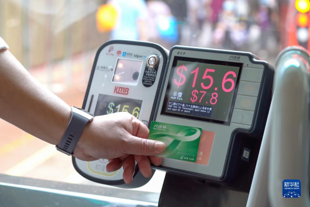 九巴工作人員示范使用長(cháng)者八達通乘車(chē)(5月12日攝)。新華社記者 龍鏡伊 攝