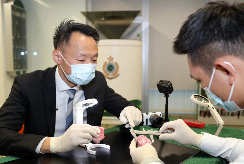 香港海關(guān)情報科監督劉玉龍(左)和同事察看玉石(8月18日攝)。新華社記者 李鋼 攝