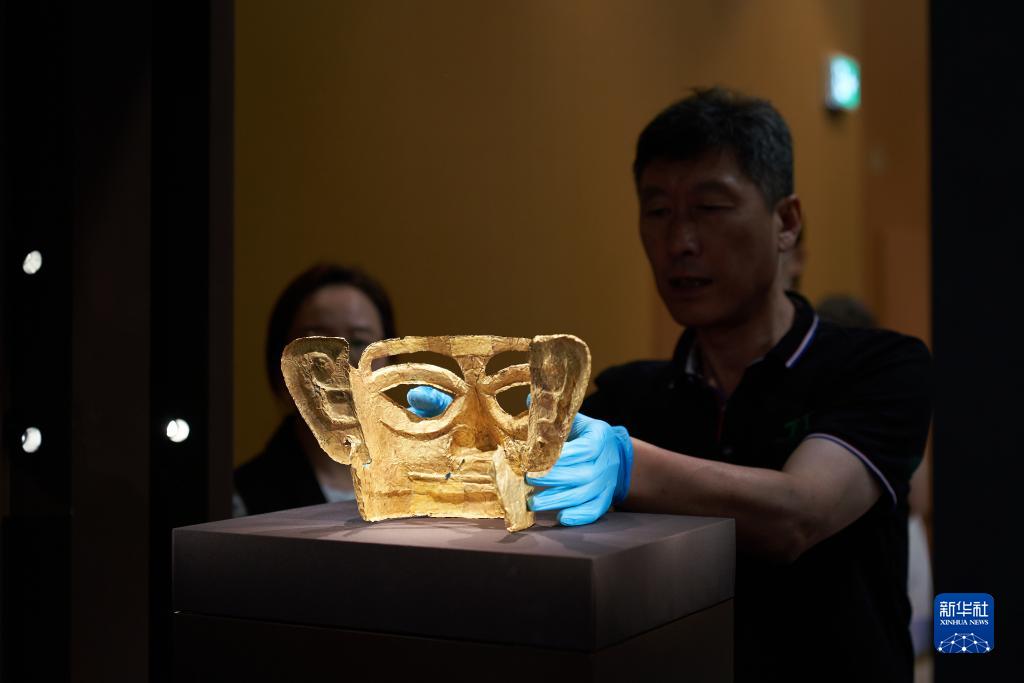 9月18日,布展團隊工作人員擺放文物“金面罩”。新華社發(fā)(香港故宮文化博物館供圖)