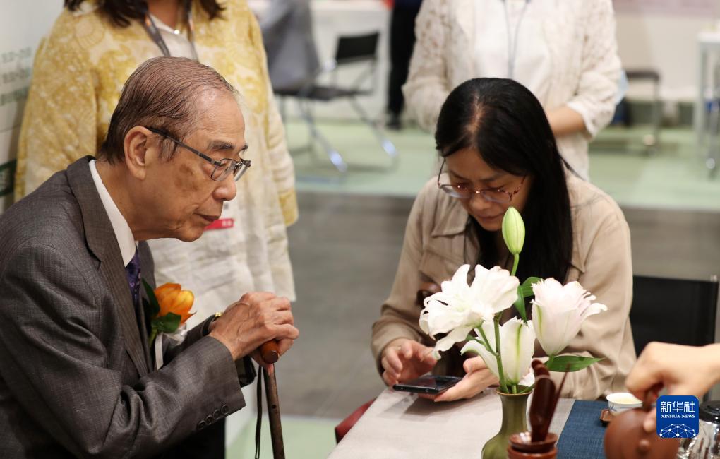 香港中國茶文化國際交流協(xié)會(huì )會(huì )長(cháng)楊孫西(左)接受新華社記者采訪(fǎng)(8月17日攝)。新華社記者 李鋼 攝