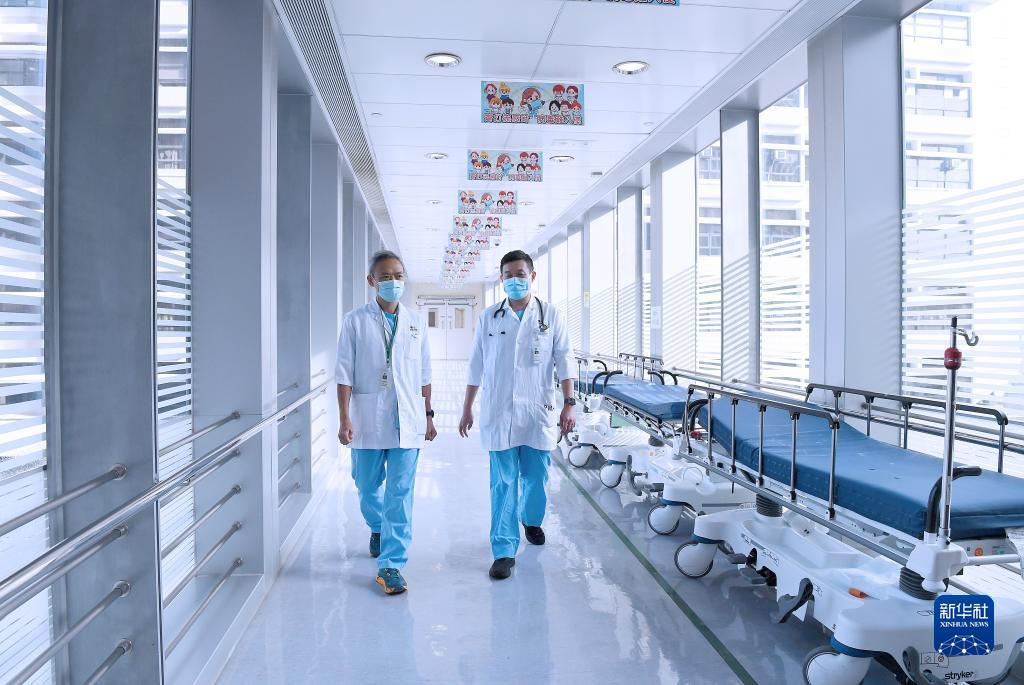 10月12日,匡煜坤(左)與楊耀昌在瑪嘉烈醫院一起工作。新華社記者 陳鐸 攝
