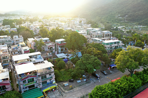 從港島出發(fā)向北,經(jīng)九龍,到新界,穿過(guò)長(cháng)長(cháng)的龍山隧道,再開(kāi)上全長(cháng)11公里的香園圍公路,一路行駛,漸入群山環(huán)抱:左手邊是深圳梧桐山下的居民小區,右手邊的白虎山下,散落著(zhù)一個(gè)個(gè)客家村落。