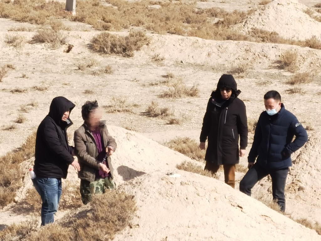犯罪嫌疑人在甘肅景泰縣指認盜墓現場(chǎng)。桂林市公安局供圖