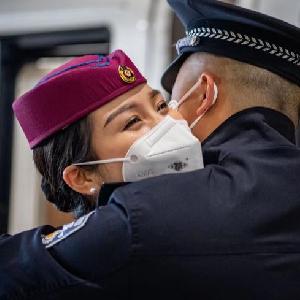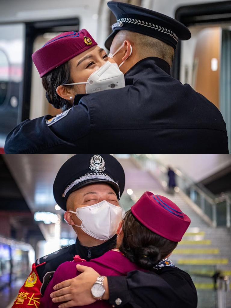 “像今天這樣能夠在待乘室見(jiàn)上一面,已經(jīng)很幸福了。有時(shí)我值勤的列車(chē)剛好到終點(diǎn)站,周幸就帶著(zhù)乘務(wù)箱準備值乘任務(wù)?!逼?lèi)傉f(shuō),今年春運,他們只有8天是在一起的。