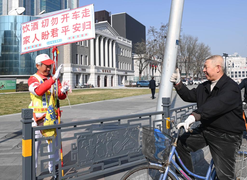 新華社太原3月4日電(記者魏飚 柴婷)“小伙子,千萬(wàn)不敢開(kāi)快了,安全第一?!痹谏轿魈逡粡V場(chǎng)東側的路口,人車(chē)喧囂中,一位老人用洪亮的嗓音,提醒外賣(mài)小哥退回斑馬線(xiàn)以?xún)?;看?jiàn)有行人闖紅燈,他馬上說(shuō):“快退回安全線(xiàn)內,注意看信號燈”……