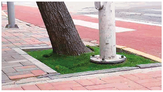 盲道的盡頭是大樹(shù)。這幾年,大樹(shù)、盲道“爭地盤(pán)”的事情在各個(gè)城市屢見(jiàn)不鮮。記者在華北某大城市的一條老街道上,一條幾十米長(cháng)的盲道修到一棵大樹(shù)下,然后連拐三個(gè)90度的彎繞過(guò)大樹(shù)?!斑@種情況時(shí)常碰到?!碑數孛と送趸壅f(shuō),自己在生活中不時(shí)會(huì )撞到樹(shù)上或被樹(shù)枝劃傷臉。記者梳理發(fā)現,近年來(lái)多個(gè)城市出現“大樹(shù)種在盲道”上的情況,引發(fā)路人吐槽。