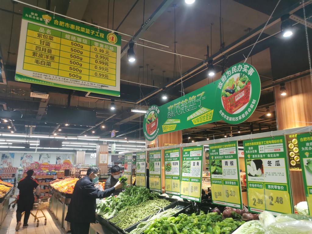 在合肥市的合家福超市丹霞翠微苑店內,多位市民正在選購蔬菜。記者看到,蔬菜區域上方“合肥市惠民菜籃子工程”的標牌上列明紫包菜、甘藍等5種蔬菜,價(jià)格統一為0.99元/斤。與此同時(shí),蔬菜區域還有兩排10余種惠民菜,其價(jià)格均低于市場(chǎng)價(jià)。
