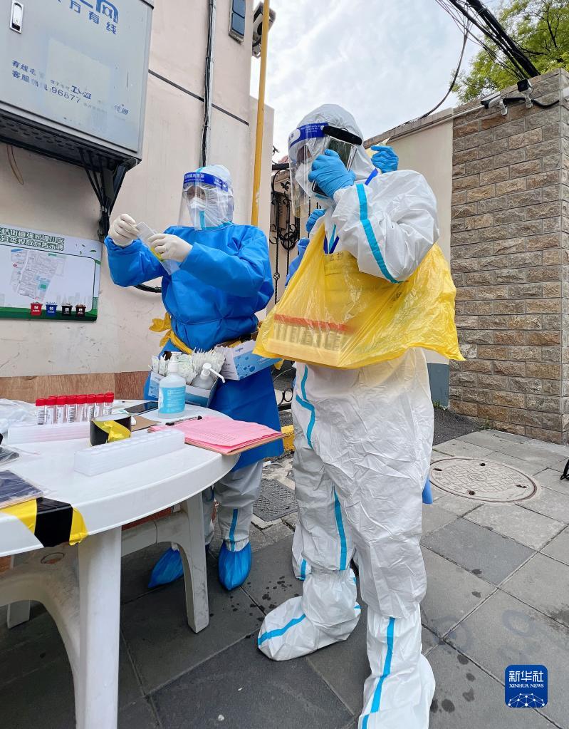 4月16日,長(cháng)寧區周家橋街道周一居民區黨總支書(shū)記張振海(右)準備陪同醫務(wù)人員進(jìn)行上門(mén)核酸檢測采樣。新華社發(fā)