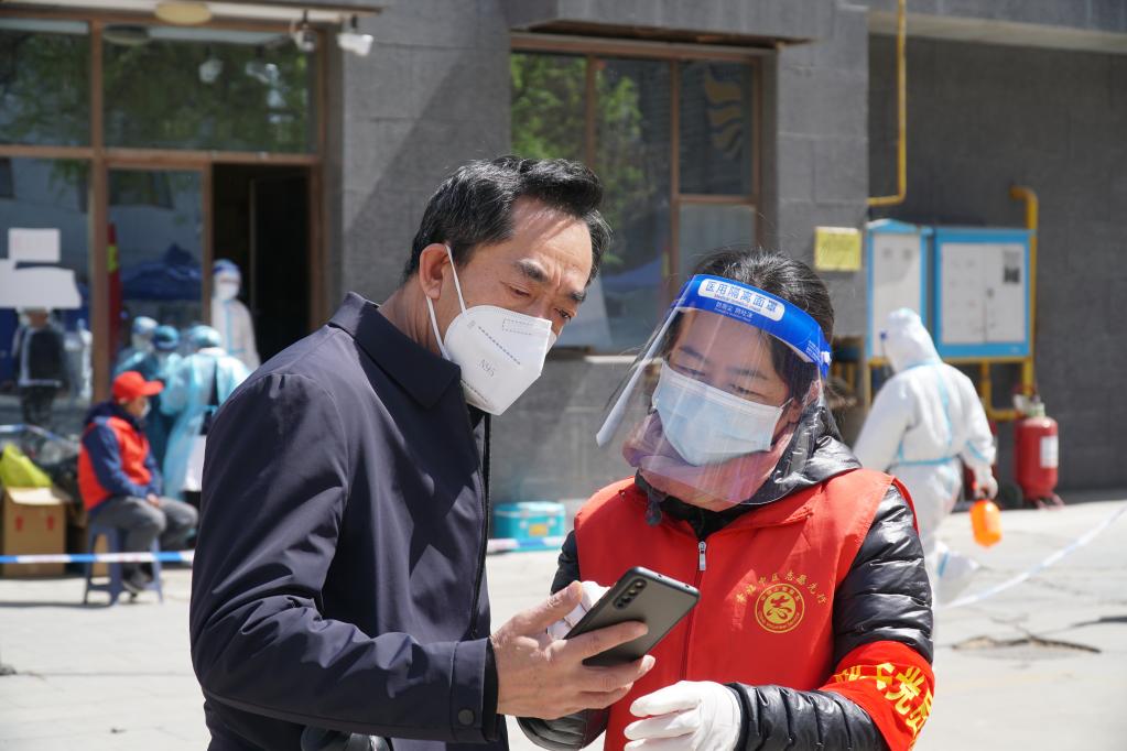 4月19日,彭娟(右一)正在幫群眾完成核酸檢測信息采集。(新華社記者 張子琪 攝)