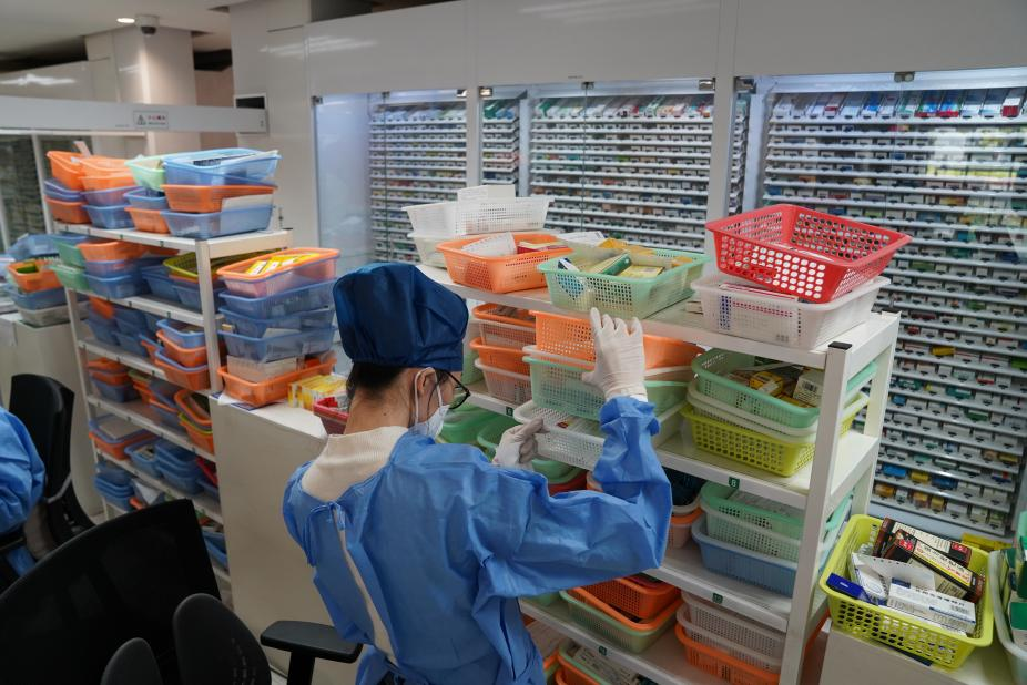 在上海市同仁醫院,醫院文員薄祿梅推著(zhù)一輛裝得滿(mǎn)滿(mǎn)當當的小推車(chē),穿梭在門(mén)診大廳。記者看到,小推車(chē)里裝的是一袋袋已經(jīng)分裝好的藥品。