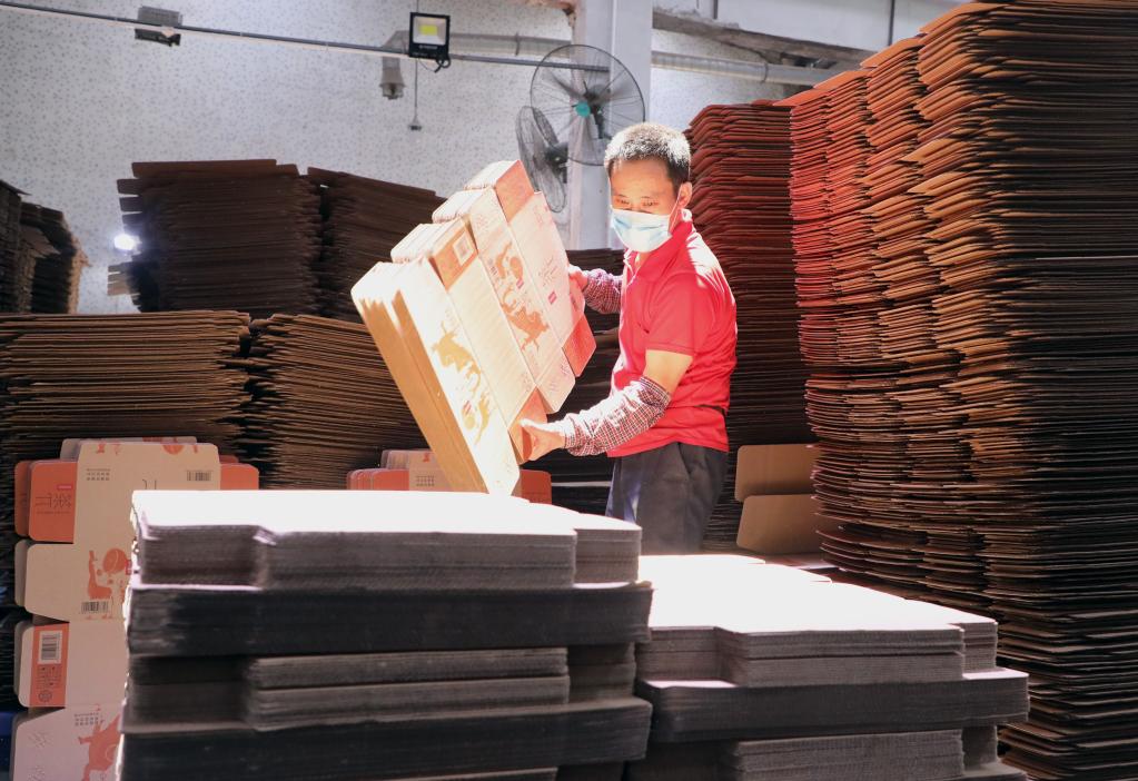 東莞市順豐紙品制造有限公司員工正在裝運產(chǎn)品(2022年4月28日攝)。 新華社記者 黃國保 攝