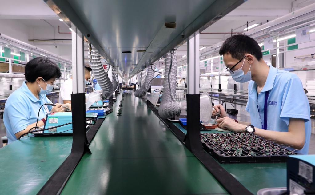 在盛洋聲學(xué)(廣東)有限公司車(chē)間內,員工正在生產(chǎn)新款耳機(2022年4月28日攝)。新華社記者 黃國保 攝
