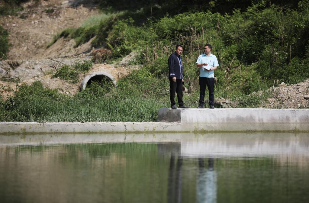 瓦窯村村支書(shū)王正華(左)和駐村第一書(shū)記彭強(右)檢查山塘蓄水情況。 新華社記者潘德鑫 攝