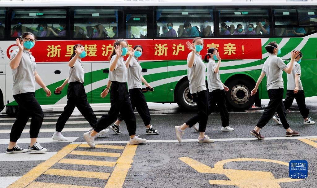 浙江省援滬醫療隊隊員列隊走過(guò)停放在位于上海市浦東新區駐地外的大巴旁(5月24日攝)。當日,浙江省援滬醫療隊圓滿(mǎn)完成援滬任務(wù)啟程返浙。新華社記者 方喆 攝