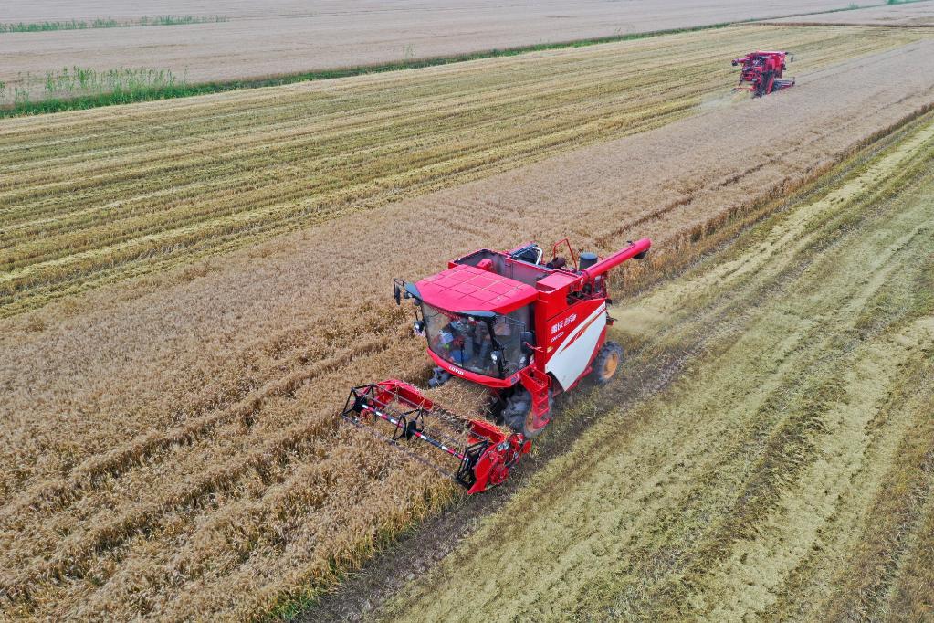 位于安徽省宿松縣的華陽(yáng)河農場(chǎng)機收小麥現場(chǎng)。新華社發(fā) 李龍 攝