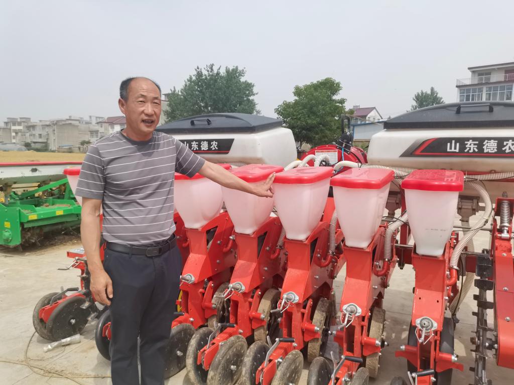 趙化向記者展示新購置的大豆玉米復式播種機。新華社記者 水金辰 攝