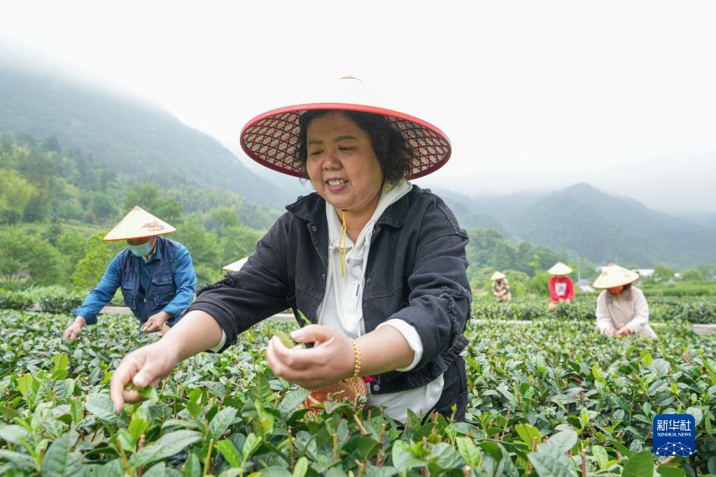 5月11日,村民在安徽省金寨縣花石鄉大灣村生態(tài)茶園內采摘茶葉。新華社記者 杜宇 攝