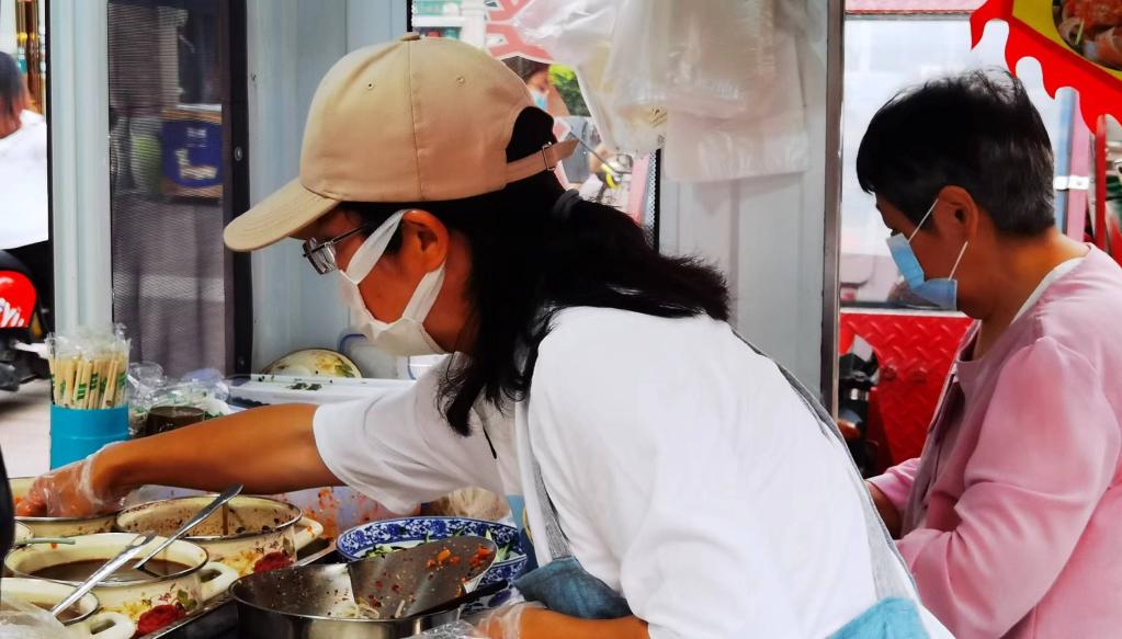 七十多歲的婆婆和朱艷并排站在攤邊,婆婆麻利接過(guò)兒媳拌好的涼皮,一份份打包好,遞到客人手中。