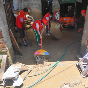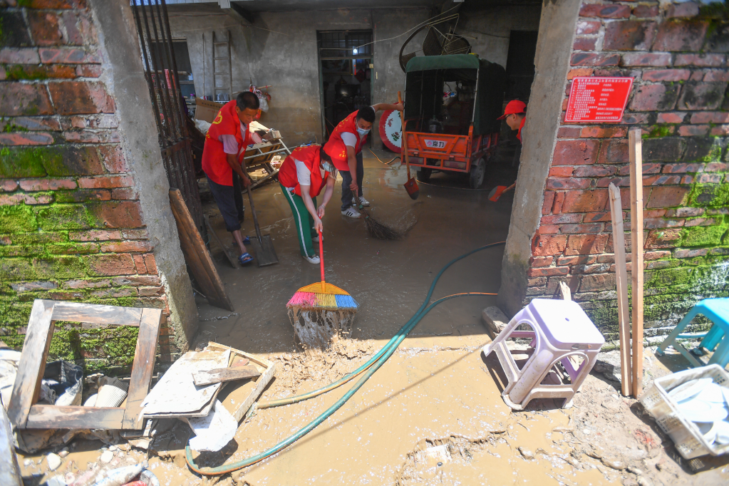 6月24日,在湖南省永州市道縣萬(wàn)家莊街道,黨員志愿者幫助居民清理淤泥。新華社記者 陳澤國 攝