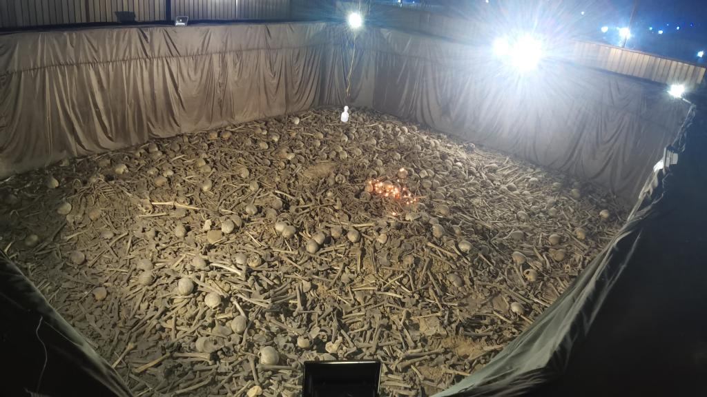 1968年10月,原鶴崗礦務(wù)局挖掘了長(cháng)約40米、寬約30米、深近7米的“萬(wàn)人坑”一角,僅在一處80平方米的挖掘角內,就發(fā)現千余具遺骨。有的遺骨被打折了脊柱,有的頭顱被子彈打穿,還有多具遺骨的眼眶被鐵絲穿過(guò)連在一起……