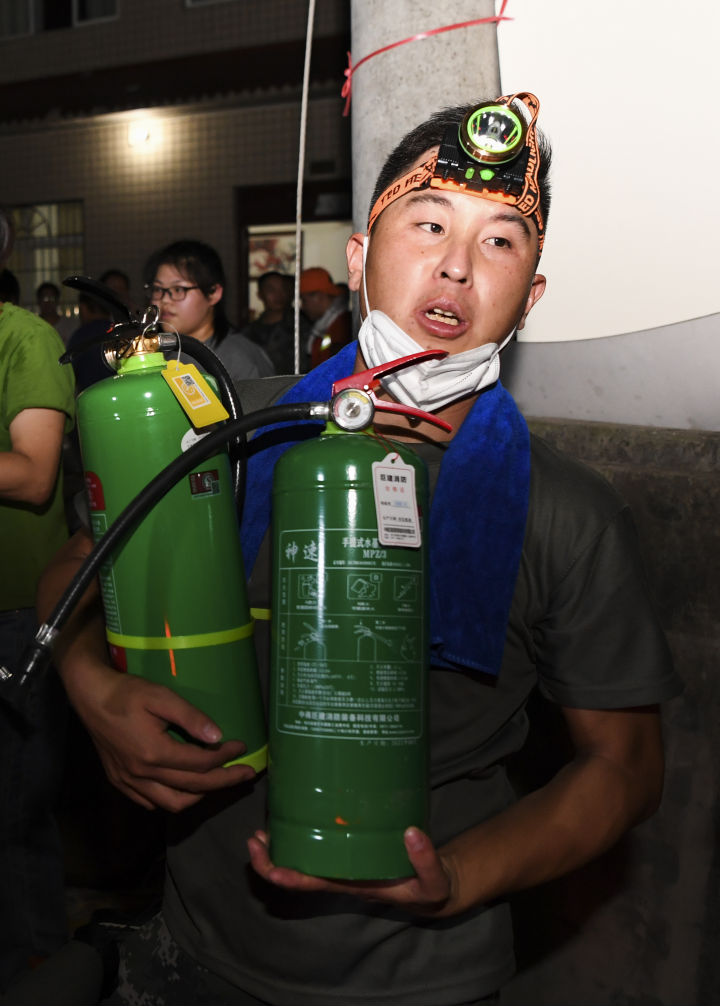 8月24日,志愿者在裝運滅火器。
