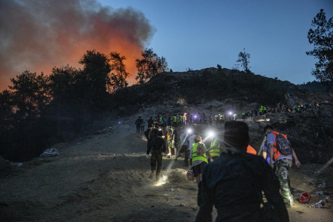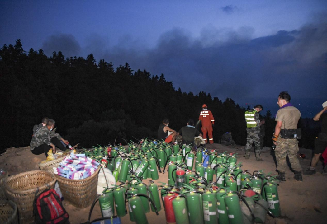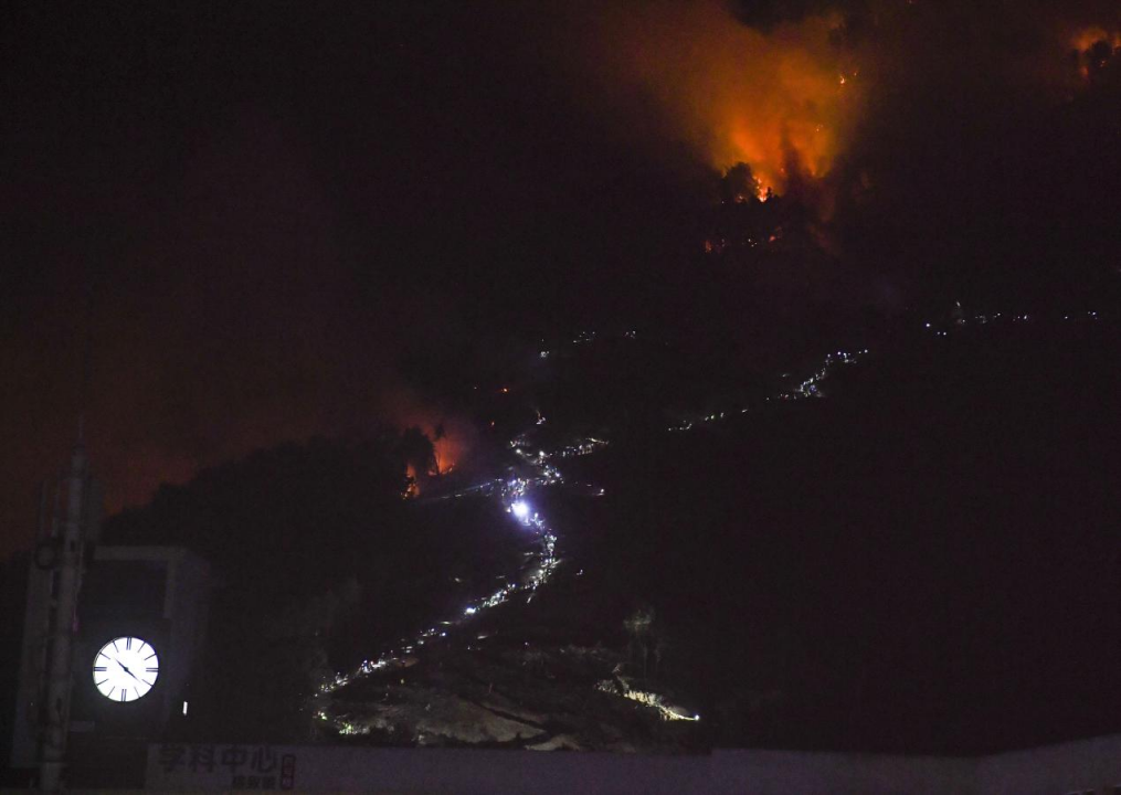8月25日晚,在山頂隔離帶,救援人員和志愿者嚴陣以待。