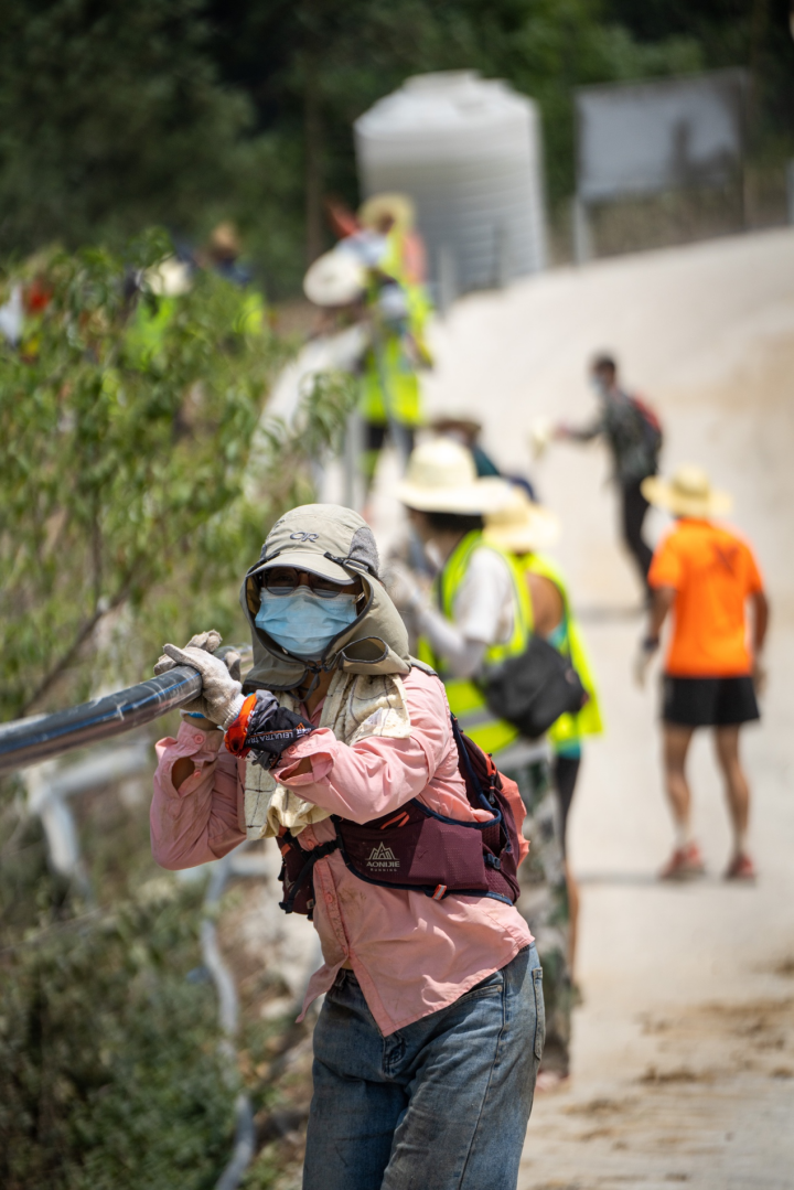 8月26日,為防止附近山火復燃,志愿者在鋪設輸水管道。