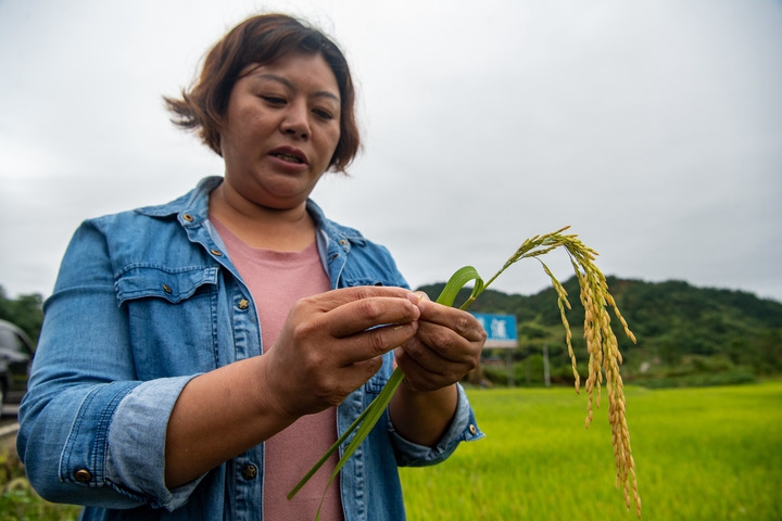 9月1日,在重慶市梁平區蟠龍鎮,種糧大戶(hù)高保燕在查看水稻成熟度。新華社記者 唐奕 攝