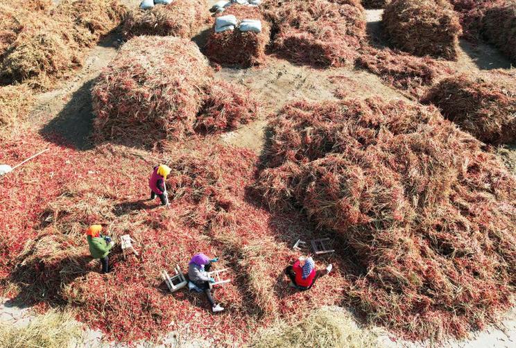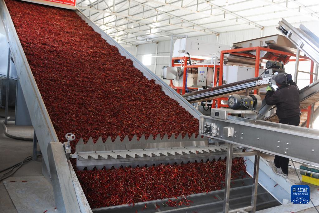 工人在白腦包鎮辣椒產(chǎn)業(yè)示范園初選辣椒。(新華社記者李云平 攝)