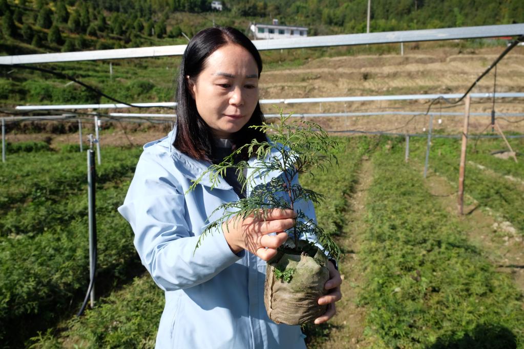 黃吉蘭在查看崖柏幼苗情況。新華社記者李曉婷 攝