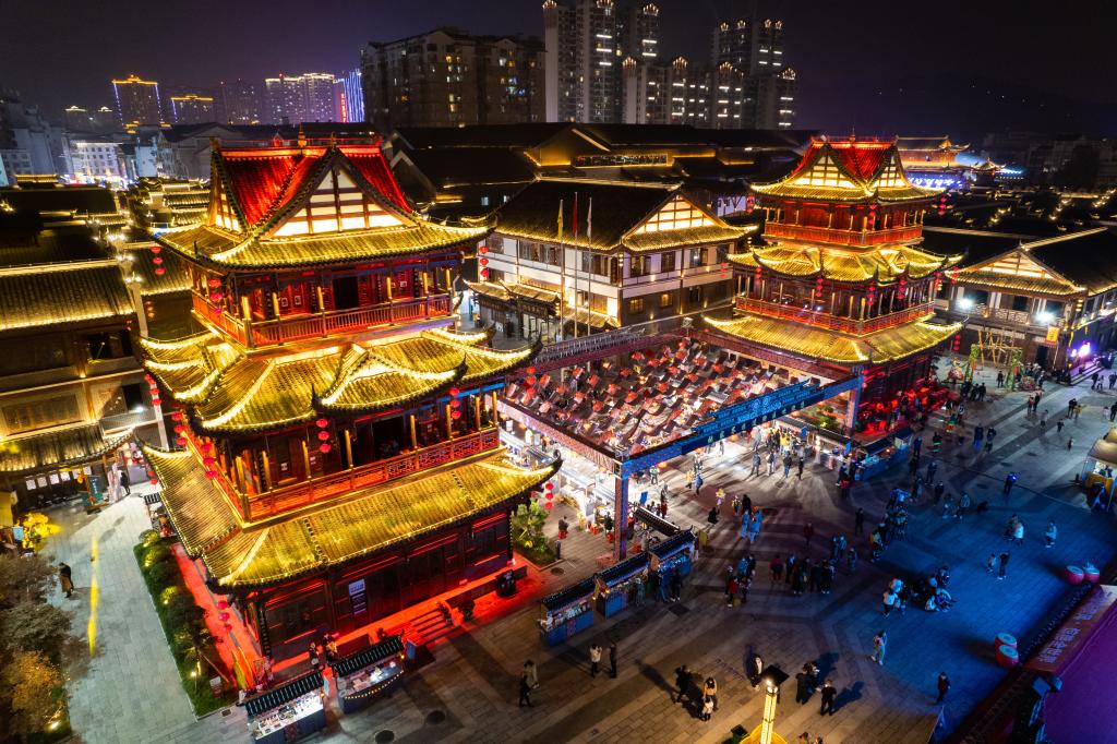 這是11月18日在張家界大庸古城拍攝的湖南省首屆非遺博覽會(huì )開(kāi)幕式(無(wú)人機照片)。新華社記者 陳思汗 攝