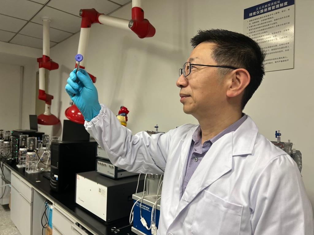 四川大學(xué)國家生物醫學(xué)材料工程技術(shù)研究中心主任王云兵展示全降解封堵器。新華社記者吳曉穎攝