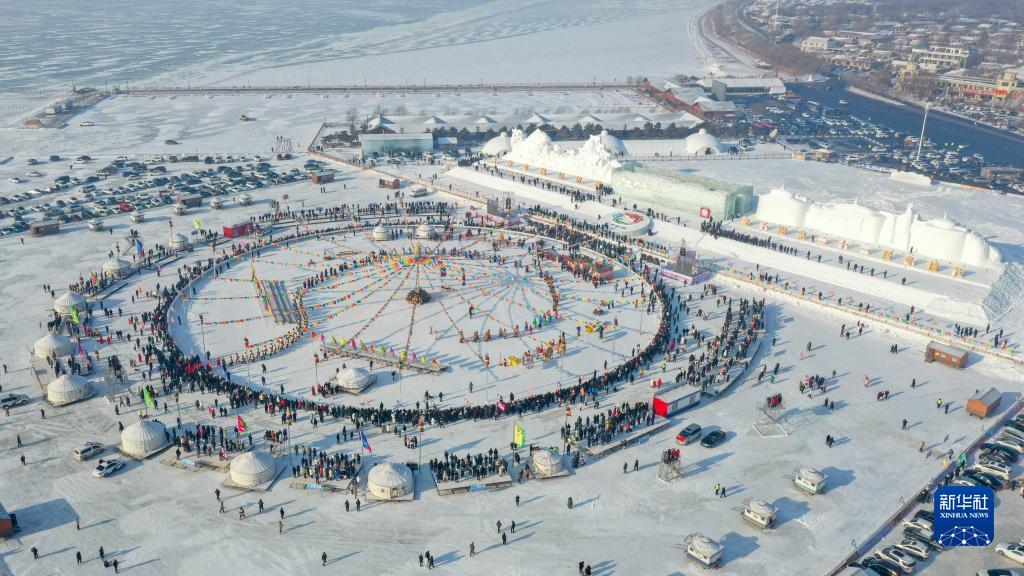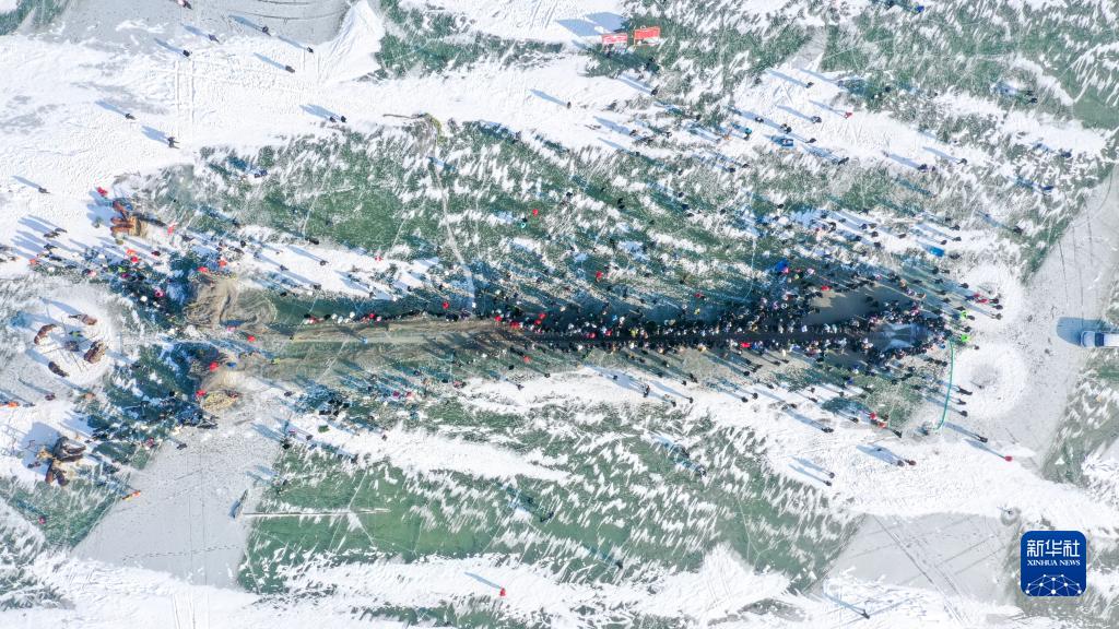 12月28日,在查干湖第二十一屆冬捕節現場(chǎng),游客觀(guān)看祭湖醒網(wǎng)儀式(無(wú)人機照片)。新華社記者 張楠
