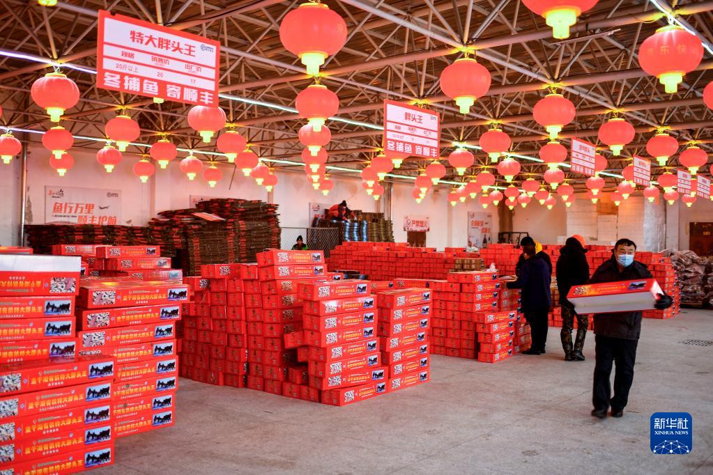 12月27日,查干湖魚(yú)產(chǎn)品超市的工作人員將各種魚(yú)類(lèi)打包裝箱。新華社記者 許暢 攝