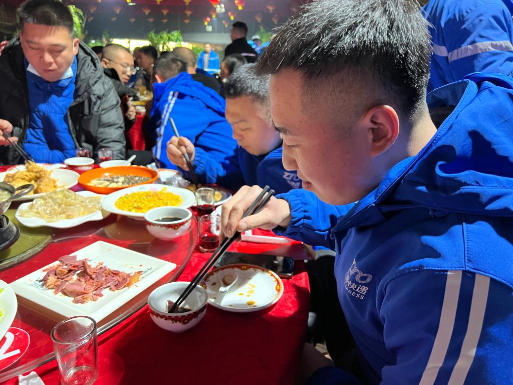 除夕夜,賈晨晨(右一)和同事們一起吃年夜飯。(受訪(fǎng)者供圖)