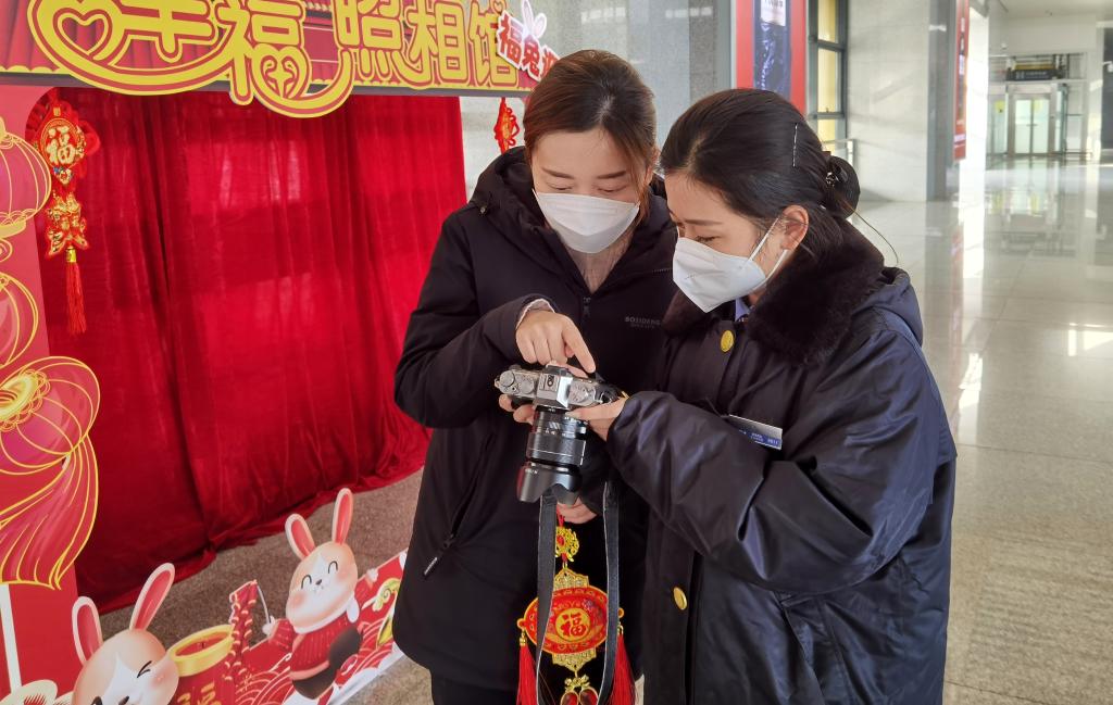 在車(chē)站一角,有一個(gè)名為“幸福照相館”的裝置,引來(lái)許多旅客圍觀(guān)并合影留念?!耙患胰嗽倏拷?,好的,一、二、三,微笑?!?1歲的王雪冰一邊拿著(zhù)相機,一邊指導旅客擺好姿勢。她也是服務(wù)隊隊員,今天擔任“幸福照相館”的攝影師。她按下快門(mén),定格旅客春運途中的幸福瞬間。