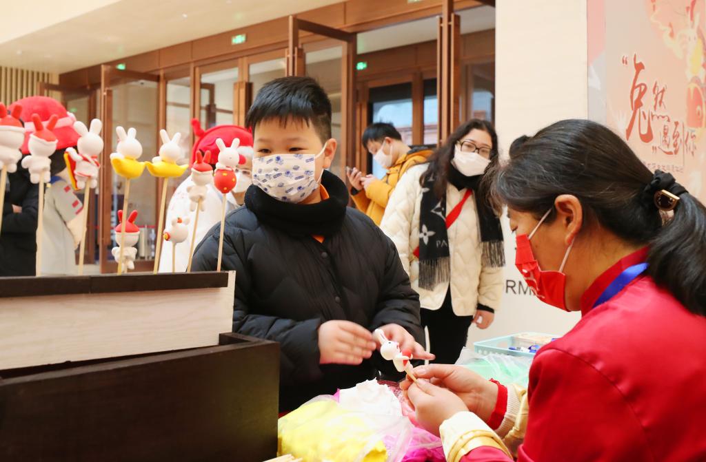 1月22日,一名小觀(guān)眾在民間手藝人教授下制作萌兔。新華社記者 方喆 攝