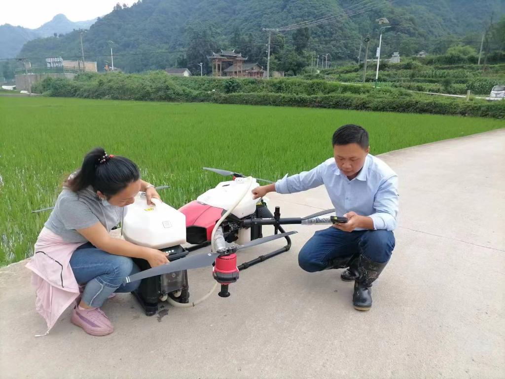 貴州麻江縣賢昌鎮高枧村糧農趙祥榕(右)在使用無(wú)人機。(受訪(fǎng)者供圖)