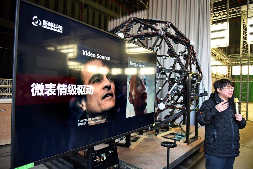 2月8日,青島東方影都影視產(chǎn)業(yè)園工作人員在介紹微表情捕捉技術(shù)。新華社記者李紫恒 攝