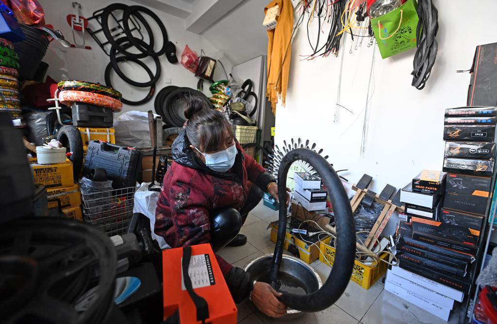 2023年2月24日,在中新天津生態(tài)城第三社區中心,一家自行車(chē)修理店經(jīng)營(yíng)者正在為顧客檢查輪胎。新華社記者趙子碩 攝