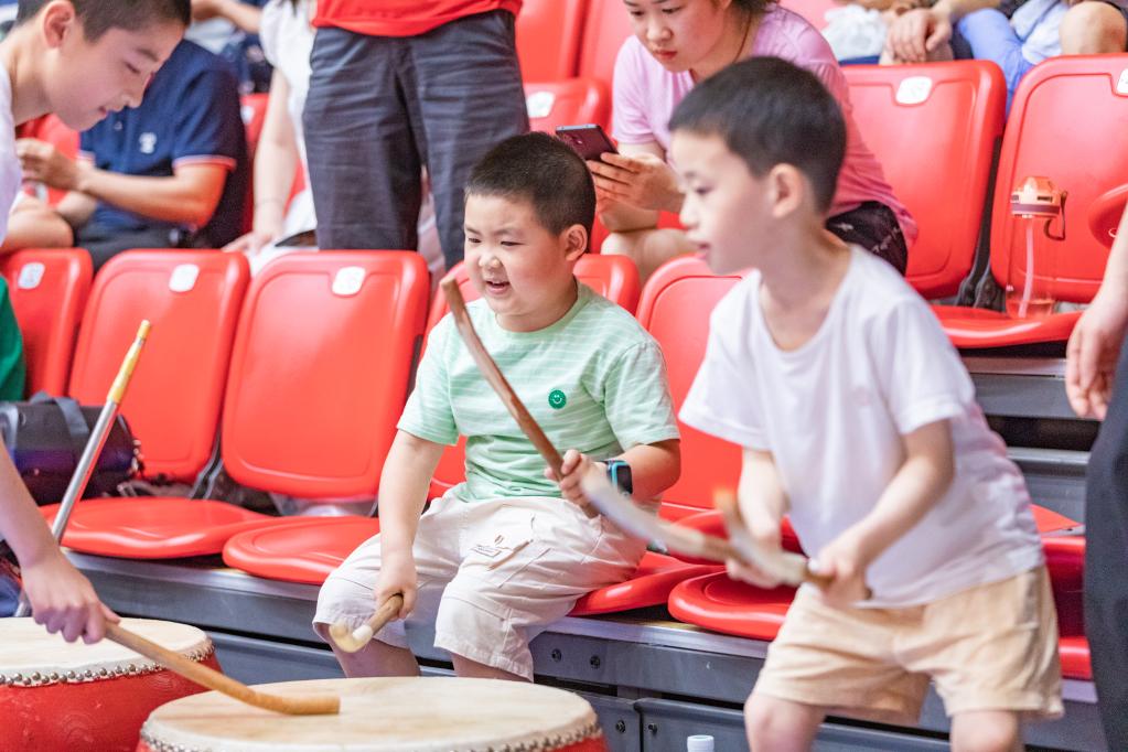 5月28日晚,小朋友在場(chǎng)邊為球員擊鼓加油。