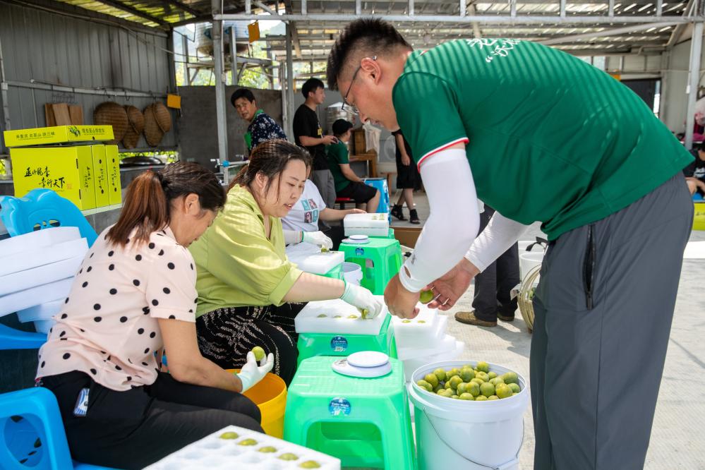 7月6日,在重慶市巫山縣巫峽鎮文峰村的巫山脆李種植園外,工作人員在選果。新華社記者儲加音 攝