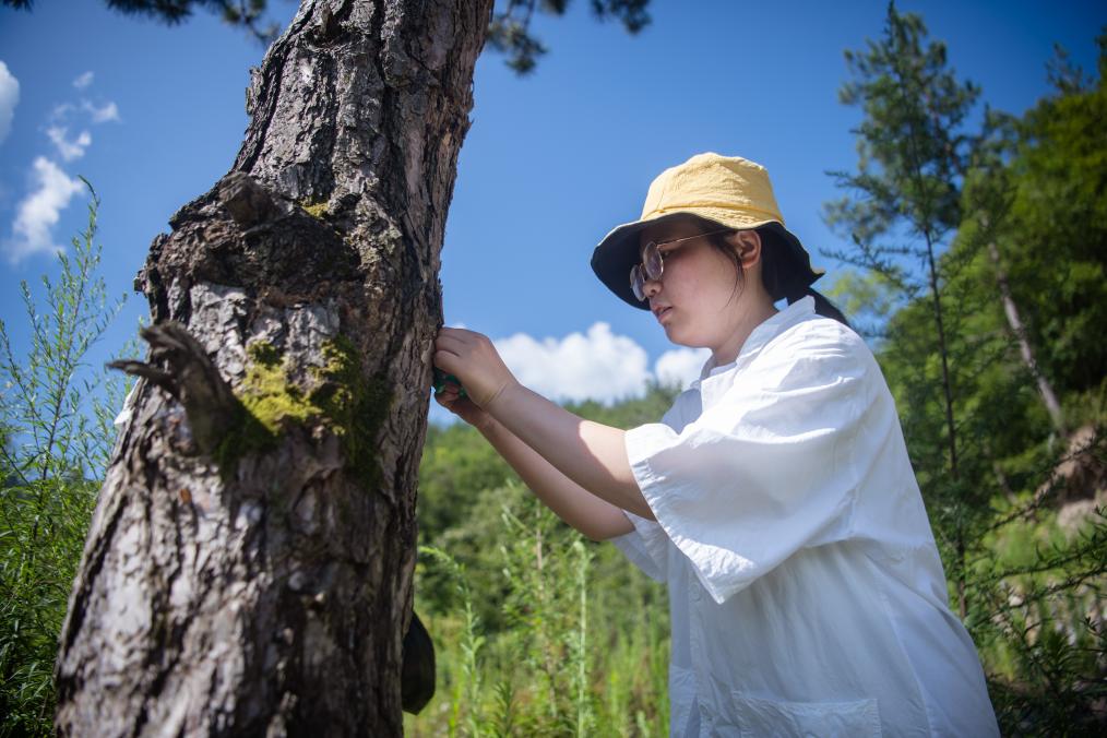 在神農架林區松柏林場(chǎng),森林病蟲(chóng)害防治工程師黃世翠無(wú)暇欣賞風(fēng)光。趁著(zhù)天氣合適,她和同事在松樹(shù)林里釋放花絨寄甲成蟲(chóng)及卵卡。