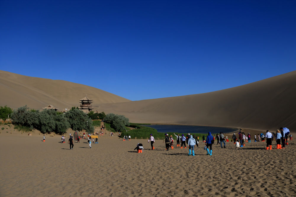 從敦煌市區出發(fā),向南行走5公里,就到了鳴沙山下。起伏黃沙勾勒出一道道利落的曲線(xiàn),三面沙山環(huán)抱,突現一泓月牙形狀的清泉,水波蕩漾,魚(yú)翔淺底。