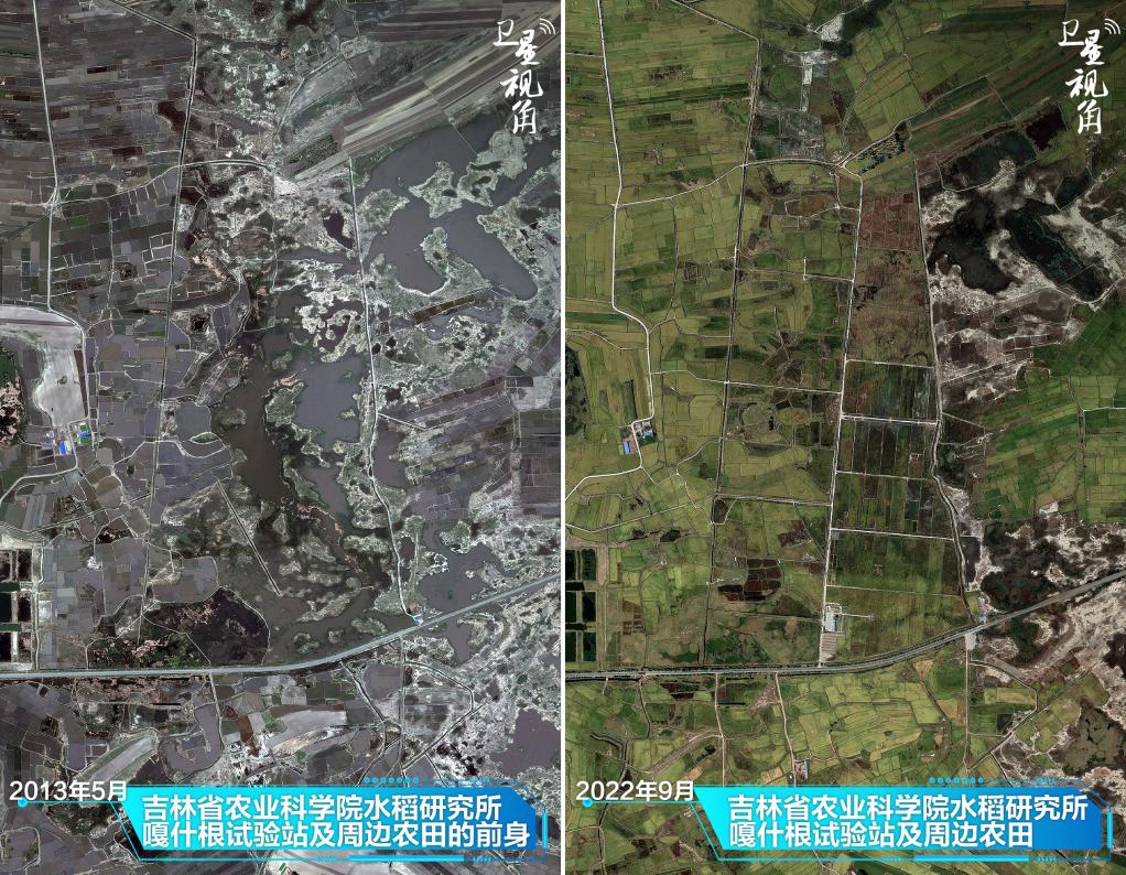 ↑2022年與2013年相比,經(jīng)過(guò)治理,吉林省白城市鎮賚縣嘎什根鄉大片鹽堿地變良田。
