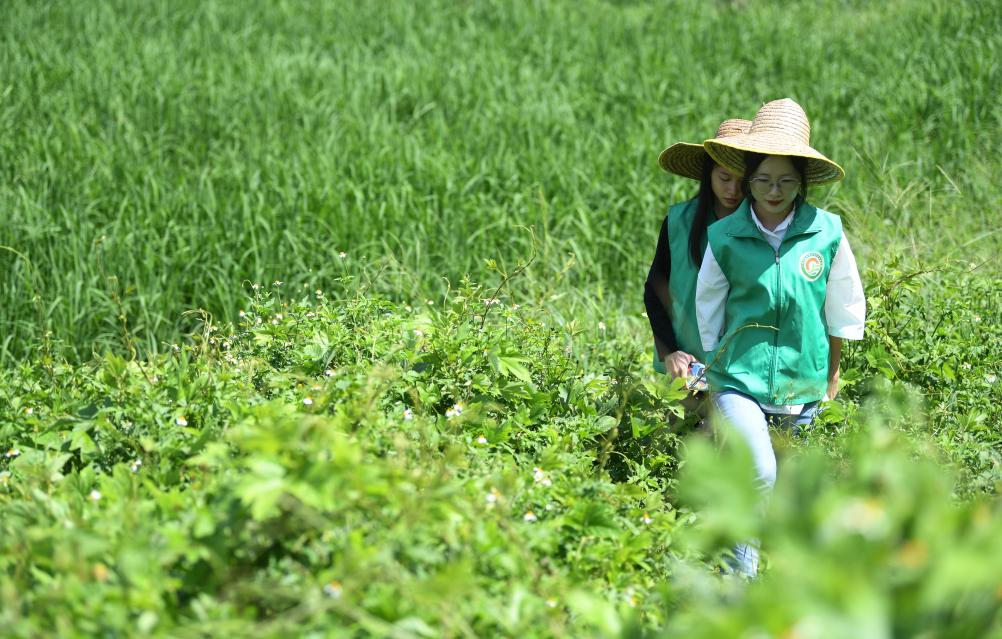 增城區一處農田,種糧大戶(hù)沈燕芬(前)查看禾苗長(cháng)勢。新華社記者鄧華 攝