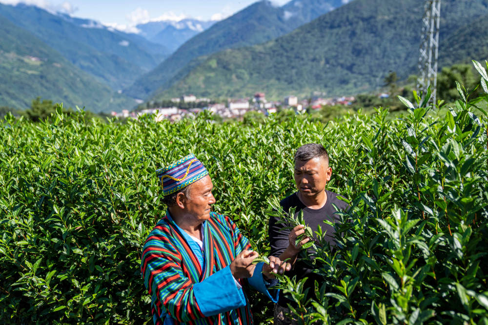 墨脫村村委會(huì )副主任達瓦次仁(右)查看茶葉生長(cháng)情況(2023年10月13日攝)。新華社記者 孫非 攝