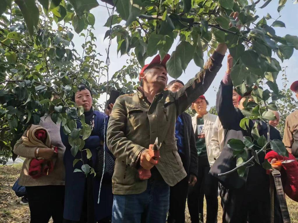 西張耿村邀請農技專(zhuān)家講授果樹(shù)修剪技術(shù)。(張倩 攝)