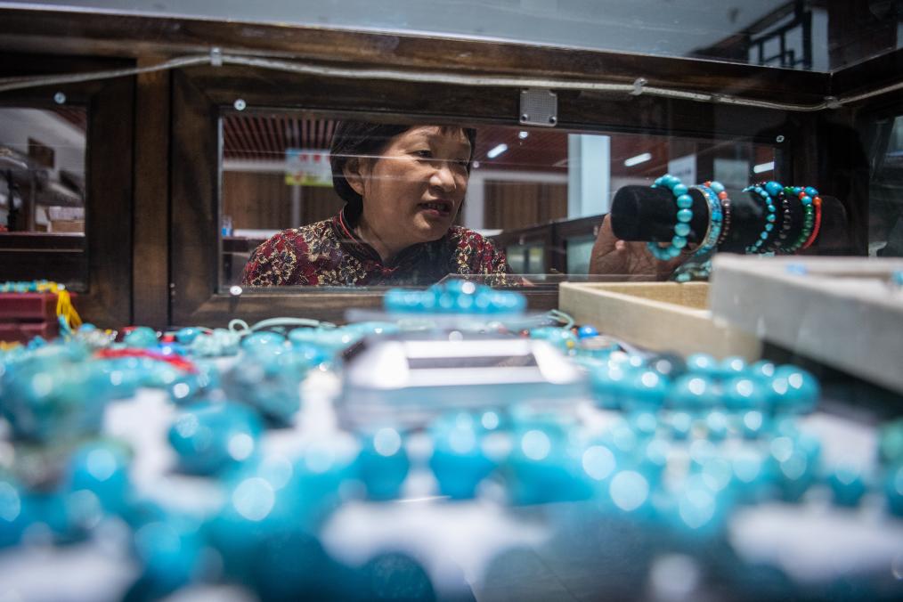 10月11日,湖北省鄖西縣下?tīng)I村村民郭明鳳在介紹自己展銷(xiāo)柜臺內的綠松石制品。新華社記者伍志尊 攝